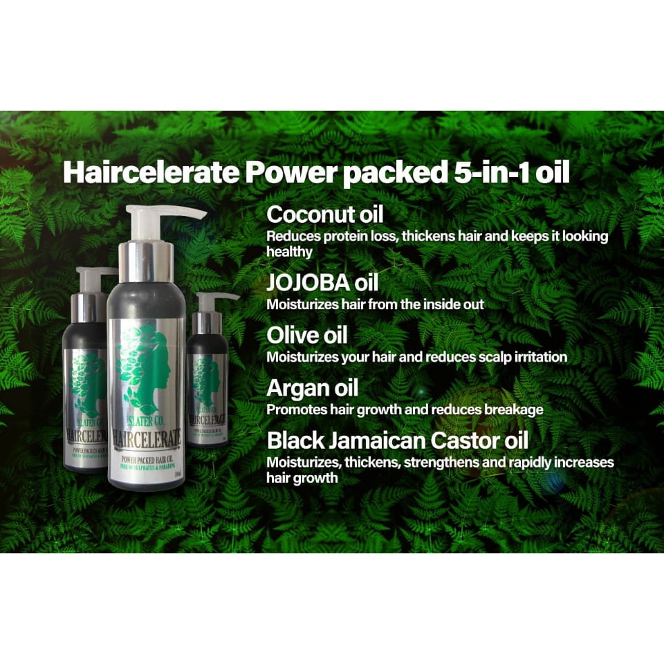 Slater Co Haircelerates 5-in-1 Power Packed Hair Oil is a meticulous blend of 5 Powerhouse hair oils namely;